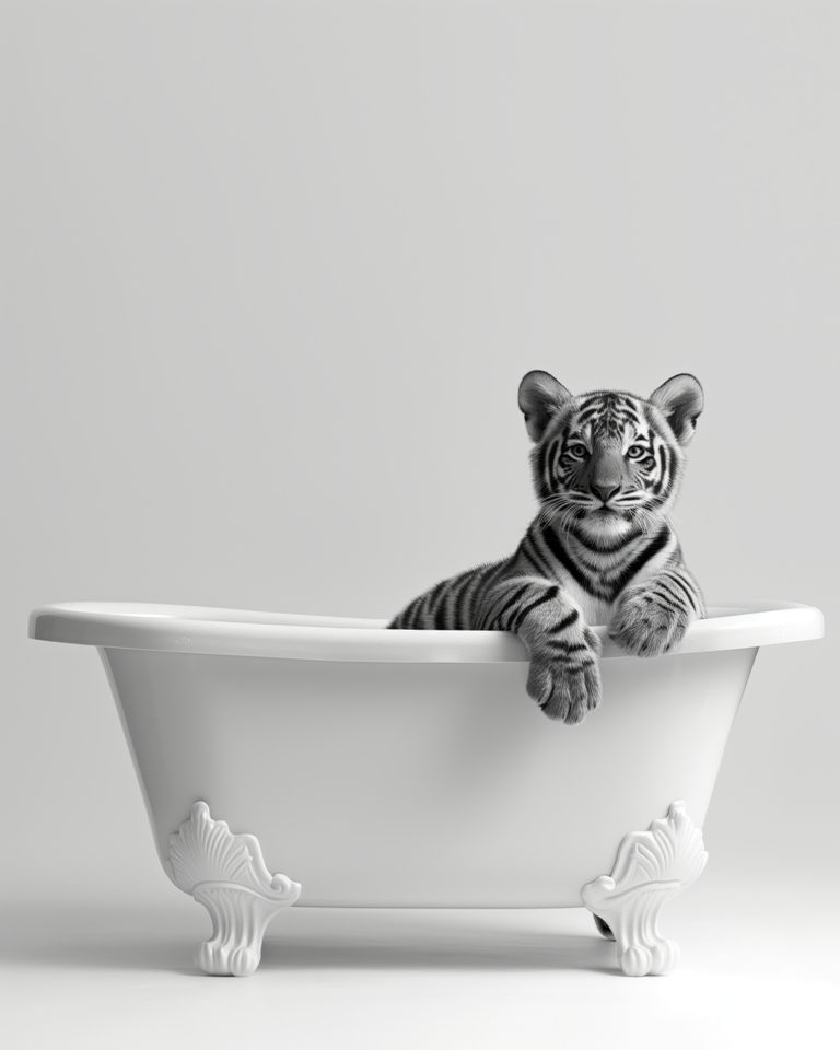 • Humour & Élégance : Le contraste amusant entre un animal sauvage et le rituel du bain dans une baignoire rétro.