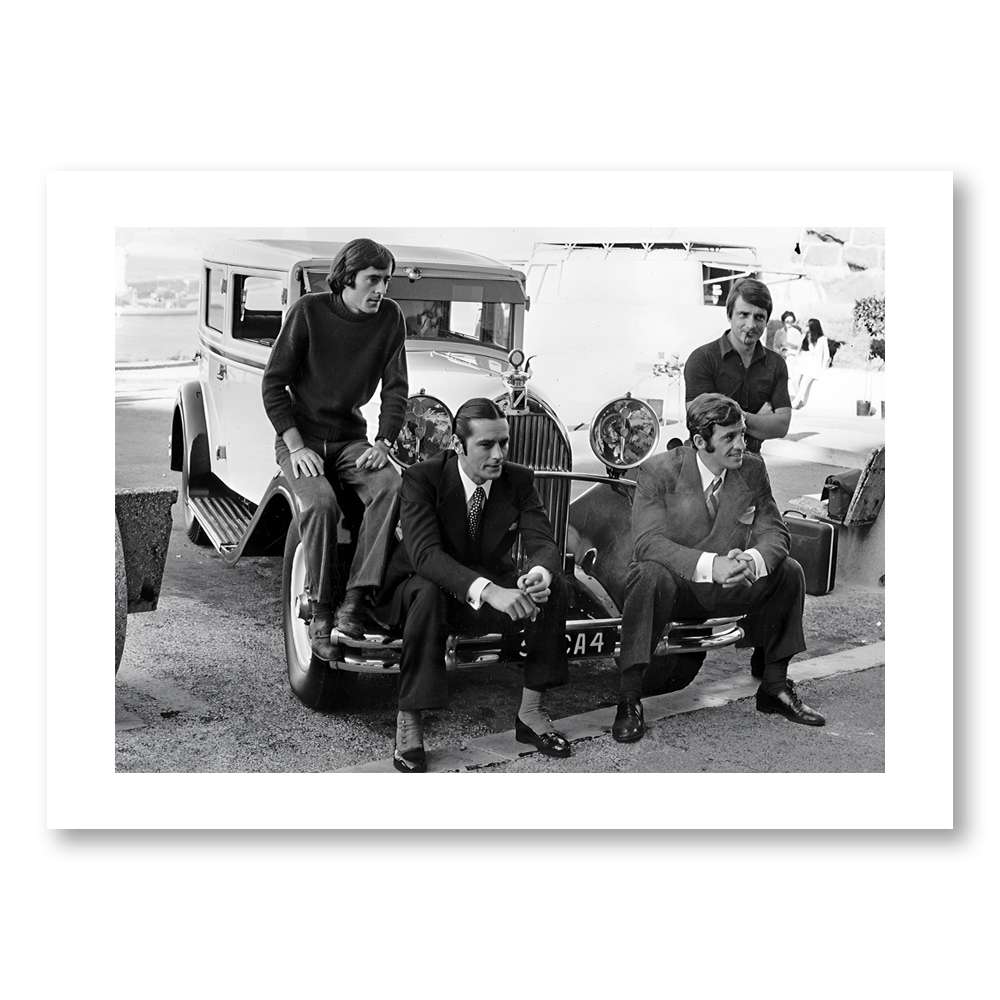 L’image respire l’ambiance des gangsters marseillais des années 30 : les deux acteurs principaux sont assis sur le pare-chocs d’une magnifique automobile d’époque, affichant cette décontraction et ce magnétisme qui leur sont propres. Le traitement en noir et blanc souligne la qualité des costumes et la force des regards, créant une œuvre graphique puissante et nostalgique.