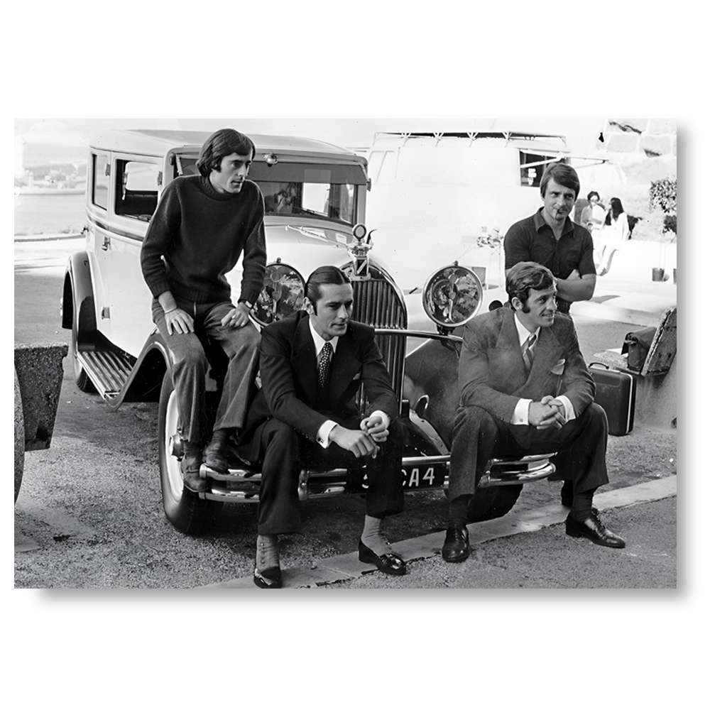 Offrez-vous un morceau de légende avec notre Affiche Delon Belmondo Borsalino capturant l’envers du décor du film « Borsalino » (1970). Ce cliché rare ne se contente pas de montrer les deux plus grandes stars de l’époque, Alain Delon et Jean-Paul Belmondo ; il nous fait entrer dans l’intimité de la production en réunissant leurs frères, Jean-François et Alain, sur le plateau de tournage.