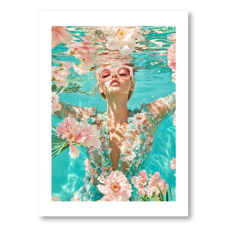 Mots-clés : couleur, couleurs vives, fleur, piscine, lunettes, mode, femme, poétique, élégant, pastel, féminin femme, affiche, poster, photo, photographie, tableau