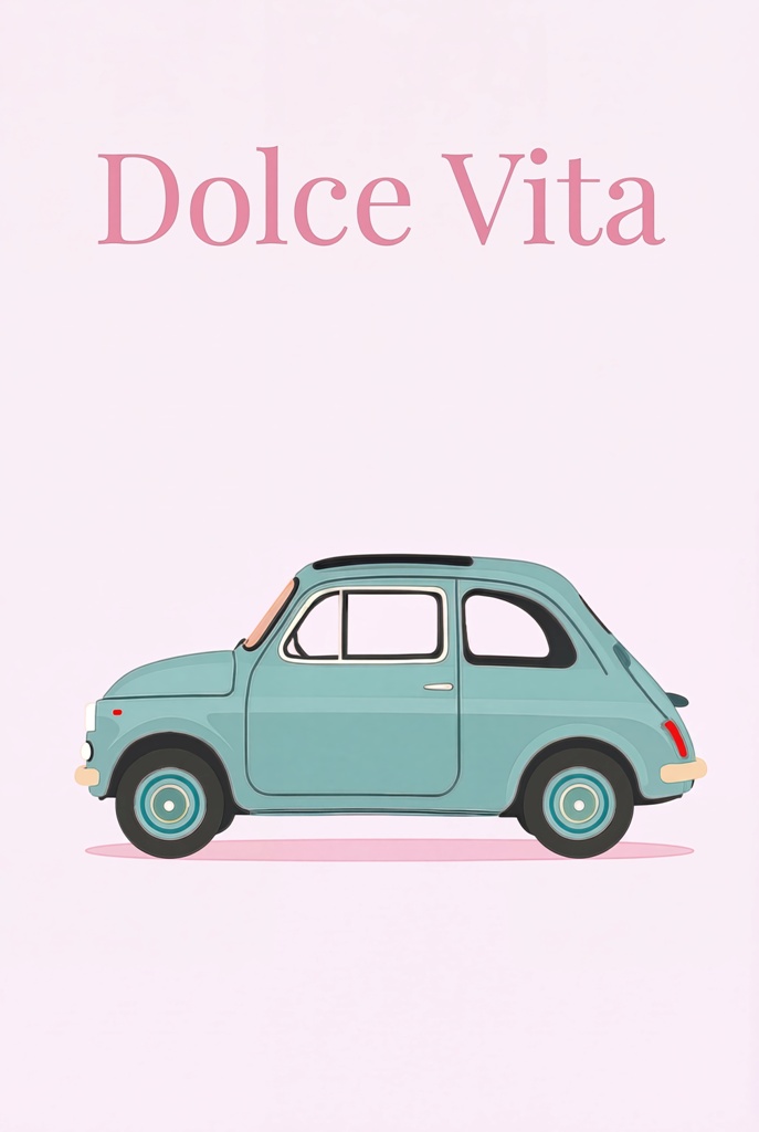 Le graphisme joue sur une esthétique « nude » et épurée. Le bleu azur de la carrosserie se détache avec douceur sur un fond rose pastel, créant une ambiance lumineuse et chaleureuse. C’est l’illustration idéale pour transformer une chambre, un coin lecture ou un salon en un espace dédié à la rêverie et au raffinement transalpin.