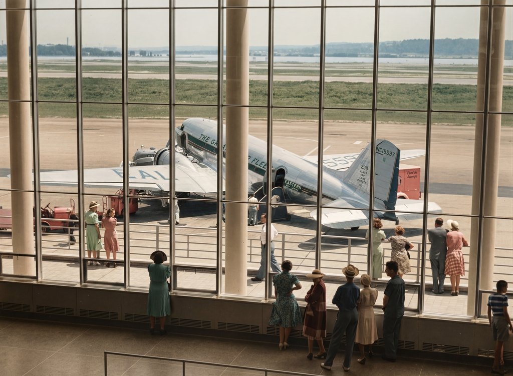Mots-clés : noir et blanc, affiche, avion, aéronef, aviation, USA, rétro, aéroport, vintage