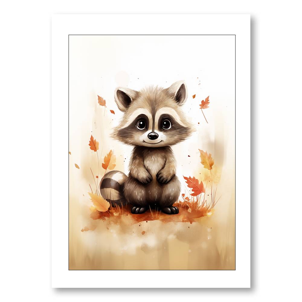Mots-clés : couleur, animal, mignon, bandit masqué, bébé, feuille, automne, peinture, aquarelle, chambre enfant, poster, affiche, tableau