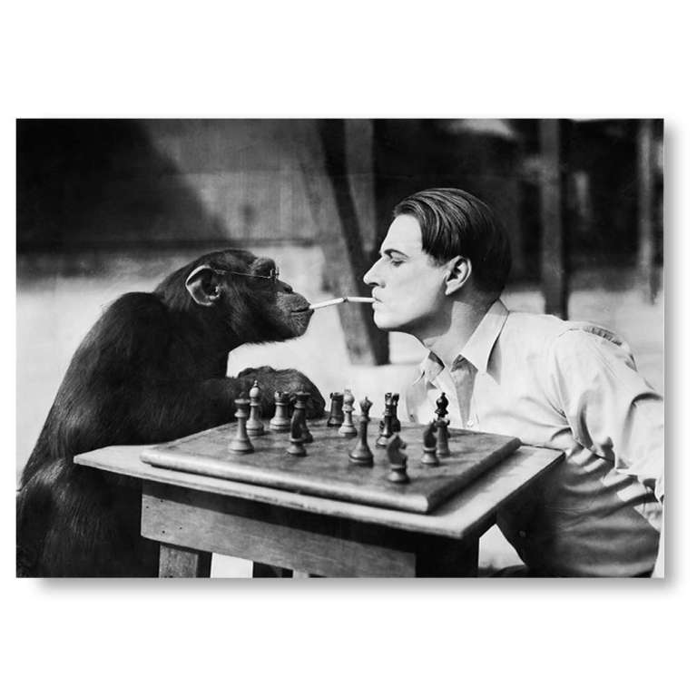 Mots-clés : noir et blanc, animal, singe, primate, homme, fumer, cigarette, années 20, affiche, animaux, poster, photo, insolite