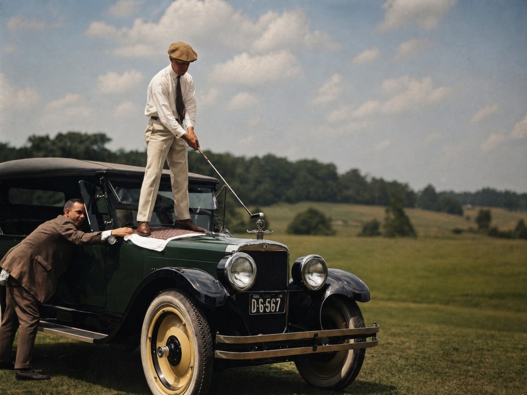 Mots-clés : noir et blanc, golf, voiture, automobile, insolite, homme, vintage, années 20, green, poster, affiche, tableau