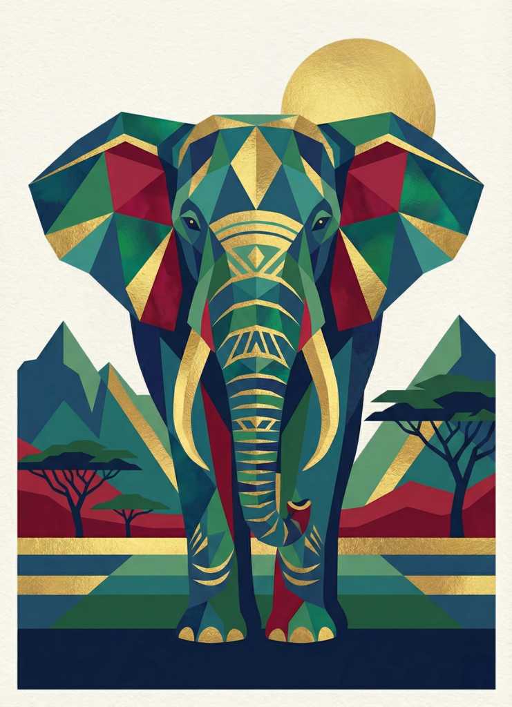 La lumière sculpte ici notre éléphant. Ses formes sont traitées en facettes géométriques modernes, rehaussées par de précieuses touches dorées qui illuminent ses défenses et la végétation environnante. Il se dégage de cette œuvre une impression de calme absolu et de stabilité.
