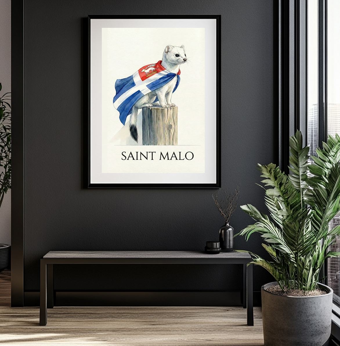 Le pavillon de la ville, avec sa croix d’argent et son quartier d’hermine, flotte avec noblesse, rappelant les grandes expéditions et l’esprit d’indépendance de la cité corsaire. Le contraste entre le blanc immaculé de l’animal et le rouge profond du drapeau crée une pièce visuelle forte, à la fois moderne et chargée d’histoire.
