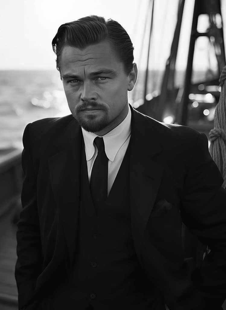 Offrez-vous cette surperbe Affiche Leonardo DiCaprio Voilier. Ce portrait en noir et blanc capture l’acteur dans une posture pleine d’assurance, évoquant les grandes épopées cinématographiques et le luxe discret des traversées transatlantiques.