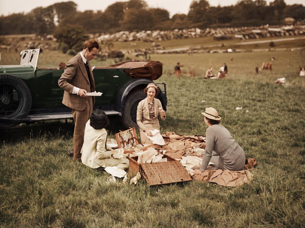 Plongez dans l’élégance champêtre absolue des Années Folles avec cette photographie captivante d’un pique-nique grand luxe. Un hymne à l’insouciance et au raffinement international.