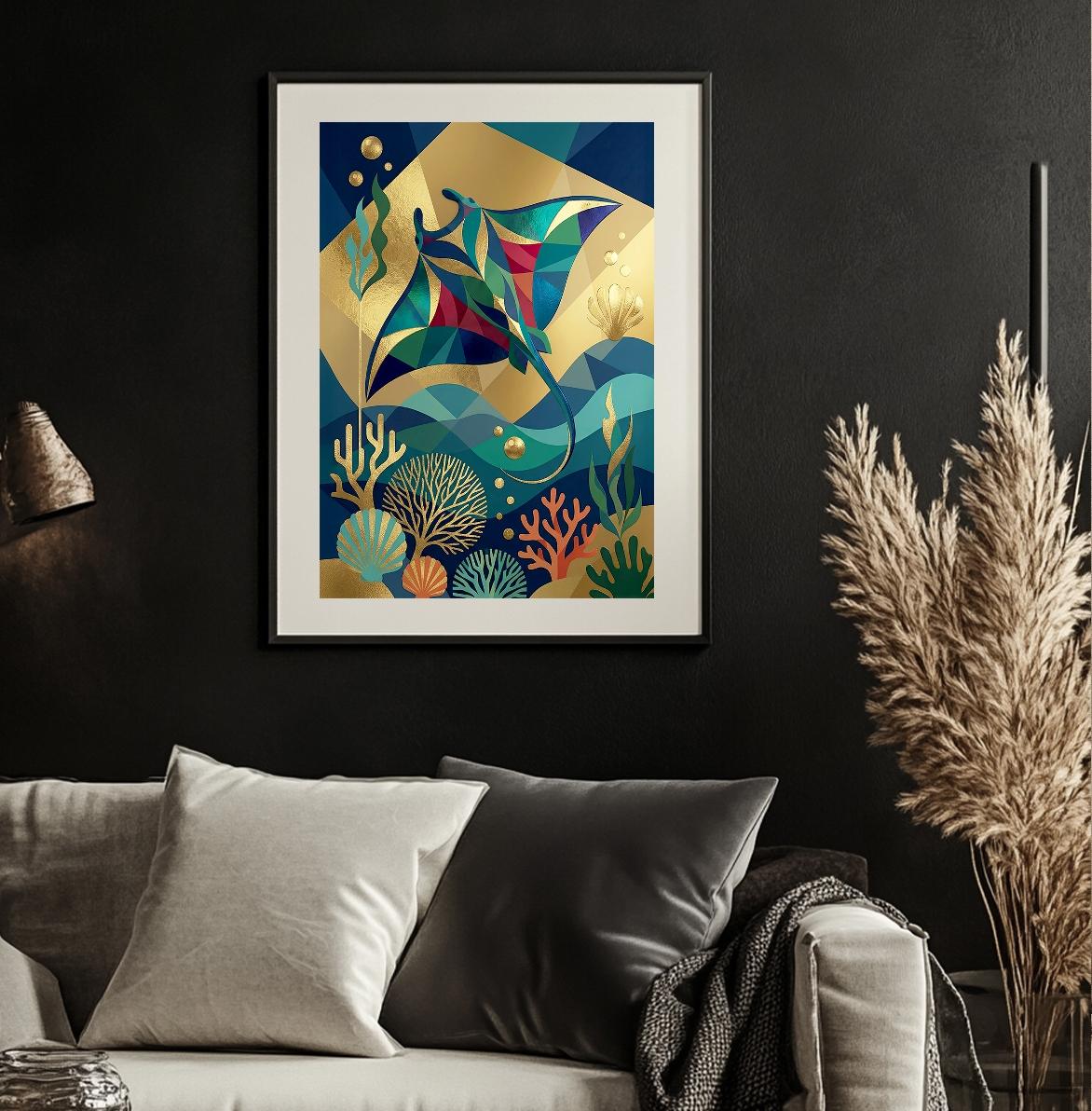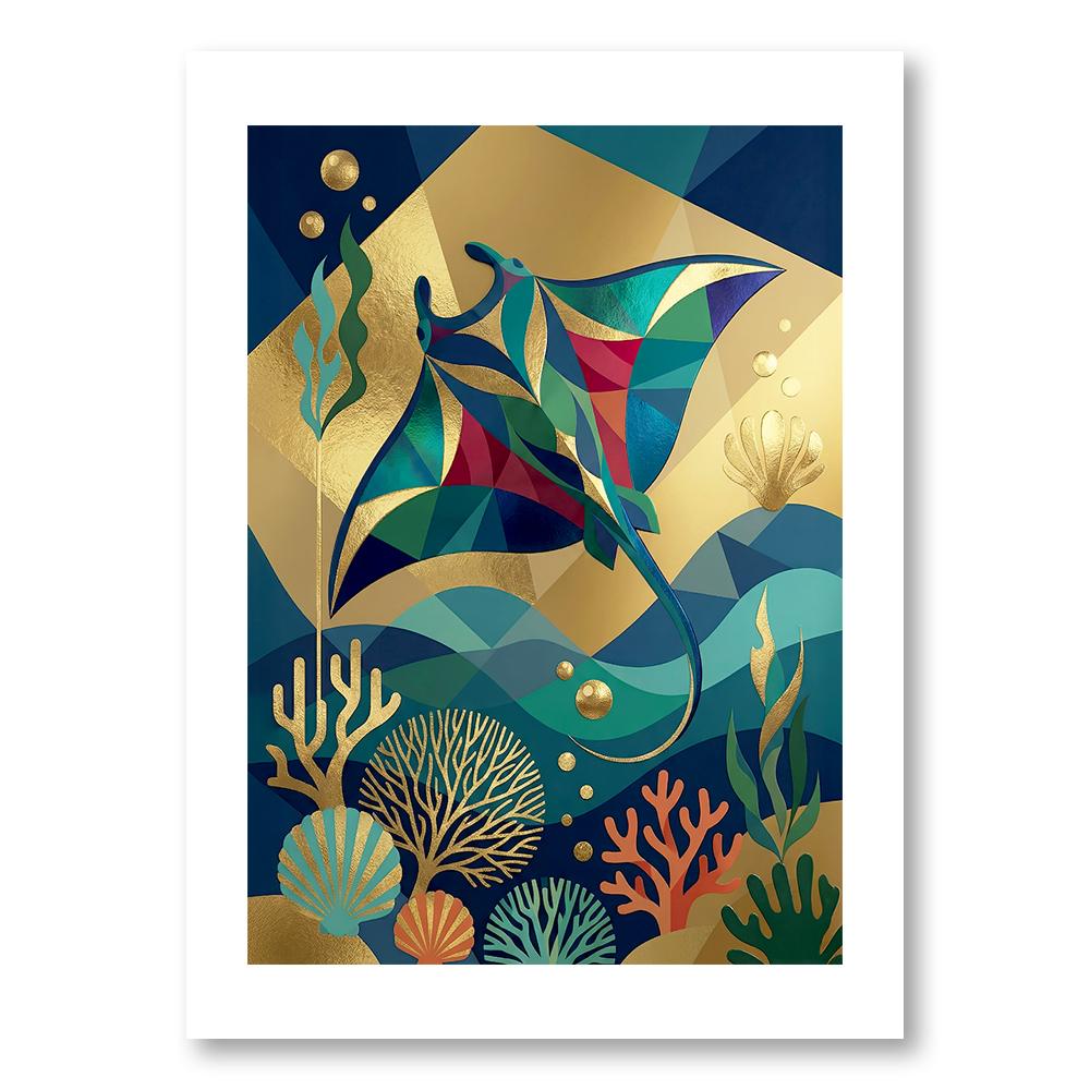 La composition est un véritable bijou graphique : la raie semble voler au-dessus d’un fond marin onirique. Les algues et les coraux se transforment en motifs dorés étincelants. Le contraste entre les bleus profonds de l’océan et l’éclat de l’or crée une œuvre à la fois mystérieuse et lumineuse.