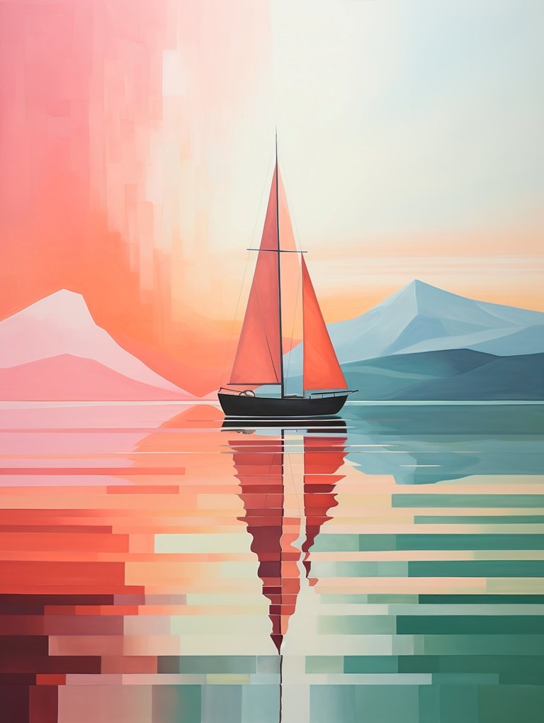 Transformez votre intérieur avec l’Affiche voilier montagnes couleurs. Cette œuvre propose une interprétation moderne du paysage marin classique. Le voilier aux voiles corail navigue entre deux mondes chromatiques fascinants. Sur la gauche, les montagnes s’illuminent de tons chauds et poudrés. À droite, les sommets bleutés apportent une profondeur et une fraîcheur bienvenue.