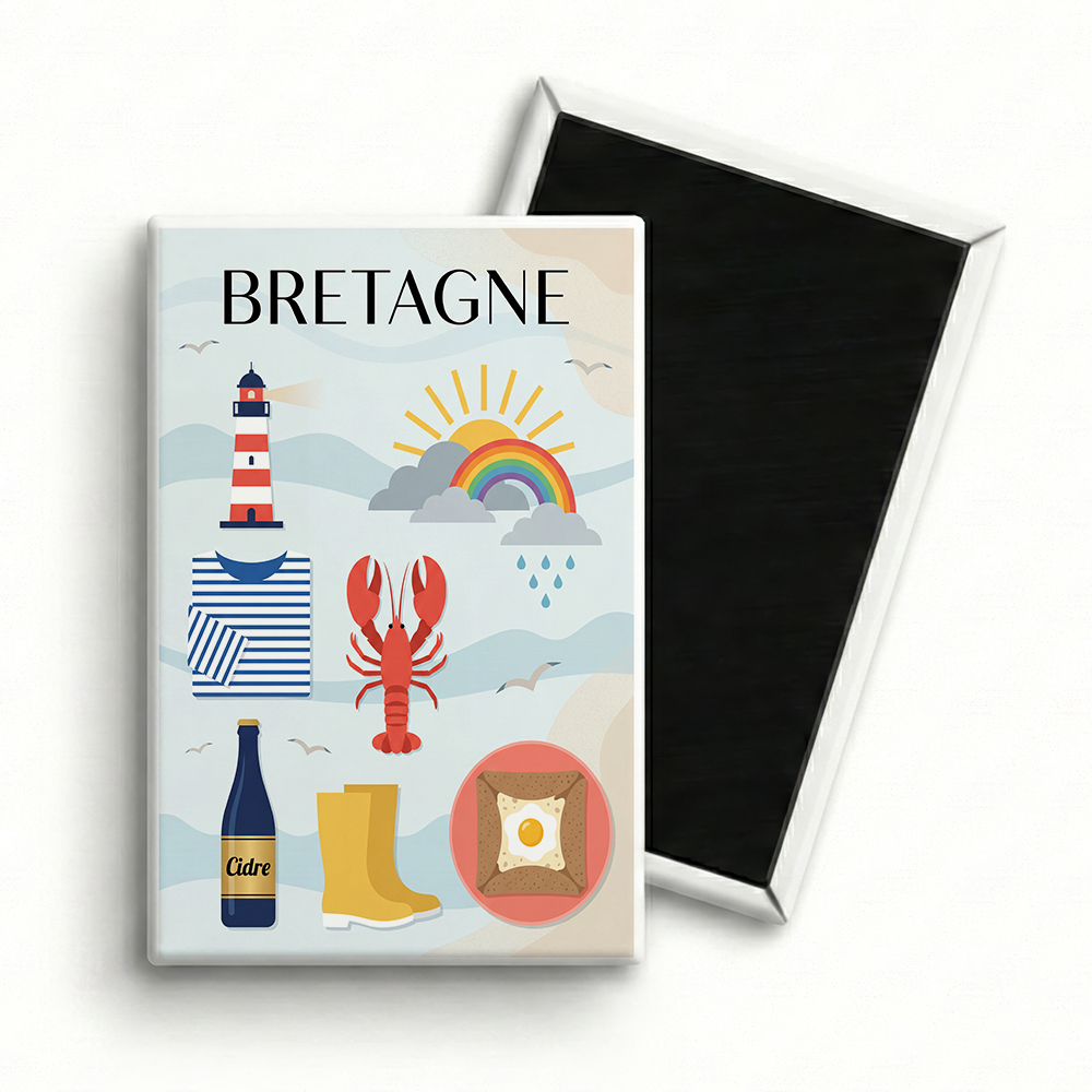 Le « Starter Pack » breton ! Un magnet graphique et moderne réunissant les indispensables de la région : le phare, la marinière, la galette, le cidre… et un peu de pluie !