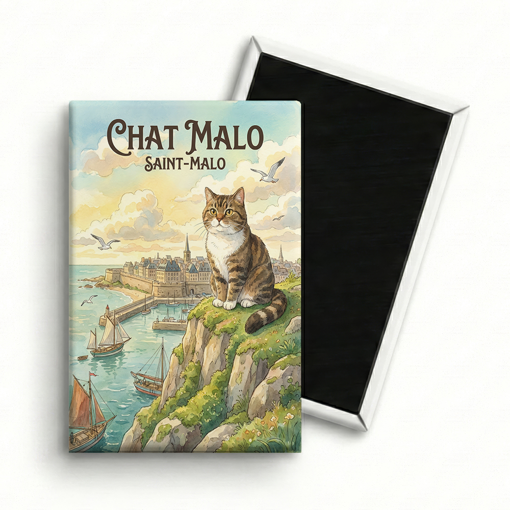 Ce magnet séduit par sa douceur et son atmosphère paisible. Perché sur son rocher fleuri, ce superbe félin observe le va-et-vient des bateaux avec la majesté d’un corsaire à la retraite. Les couleurs tendres (vert tendre, bleu ciel, beige) et le trait façon dessin animé « vintage » en font une petite œuvre d’art très attachante.