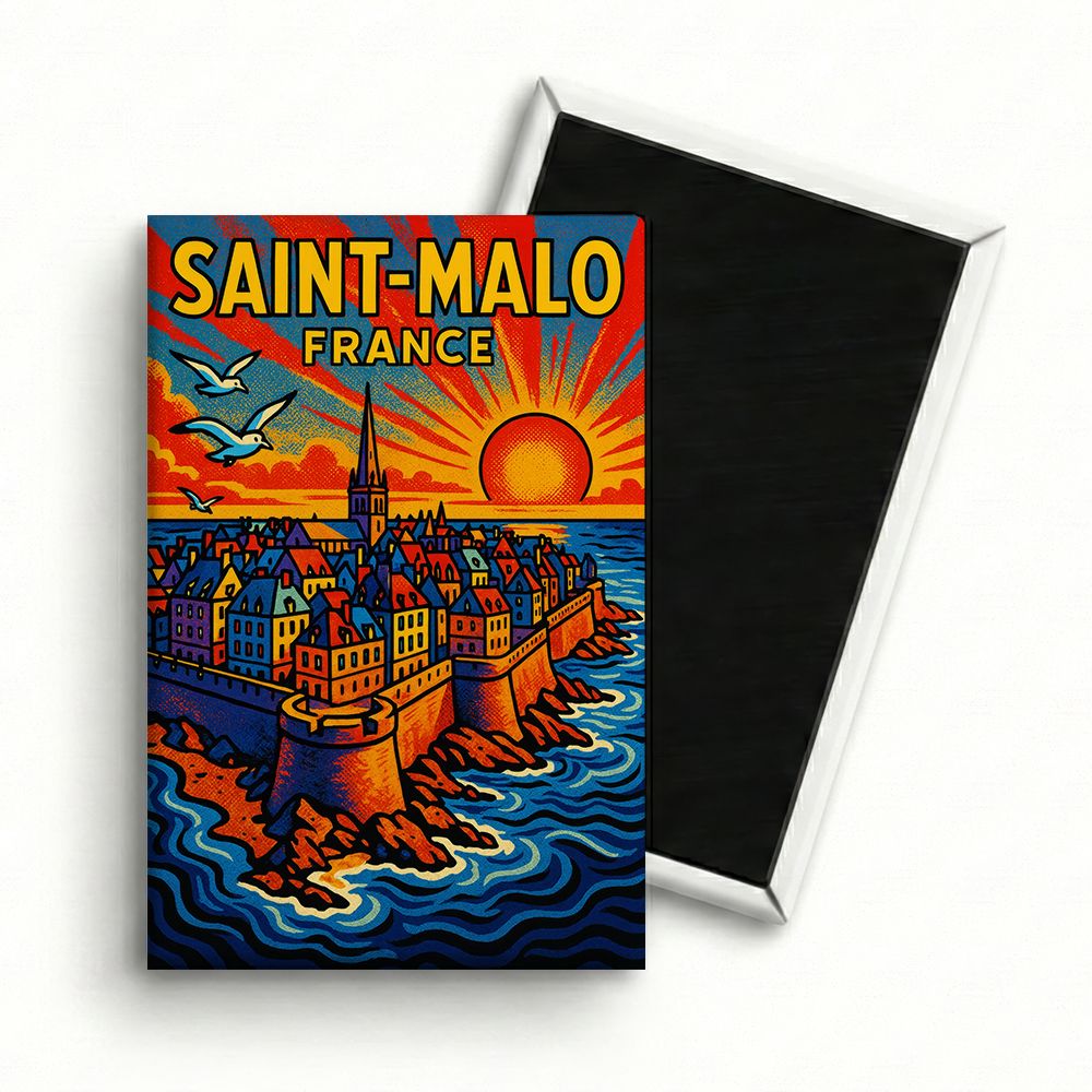 L’énergie de Saint-Malo ! Un magnet au style Pop Art vibrant, mêlant un coucher de soleil flamboyant et des vagues stylisées. Pour une déco qui a du peps.